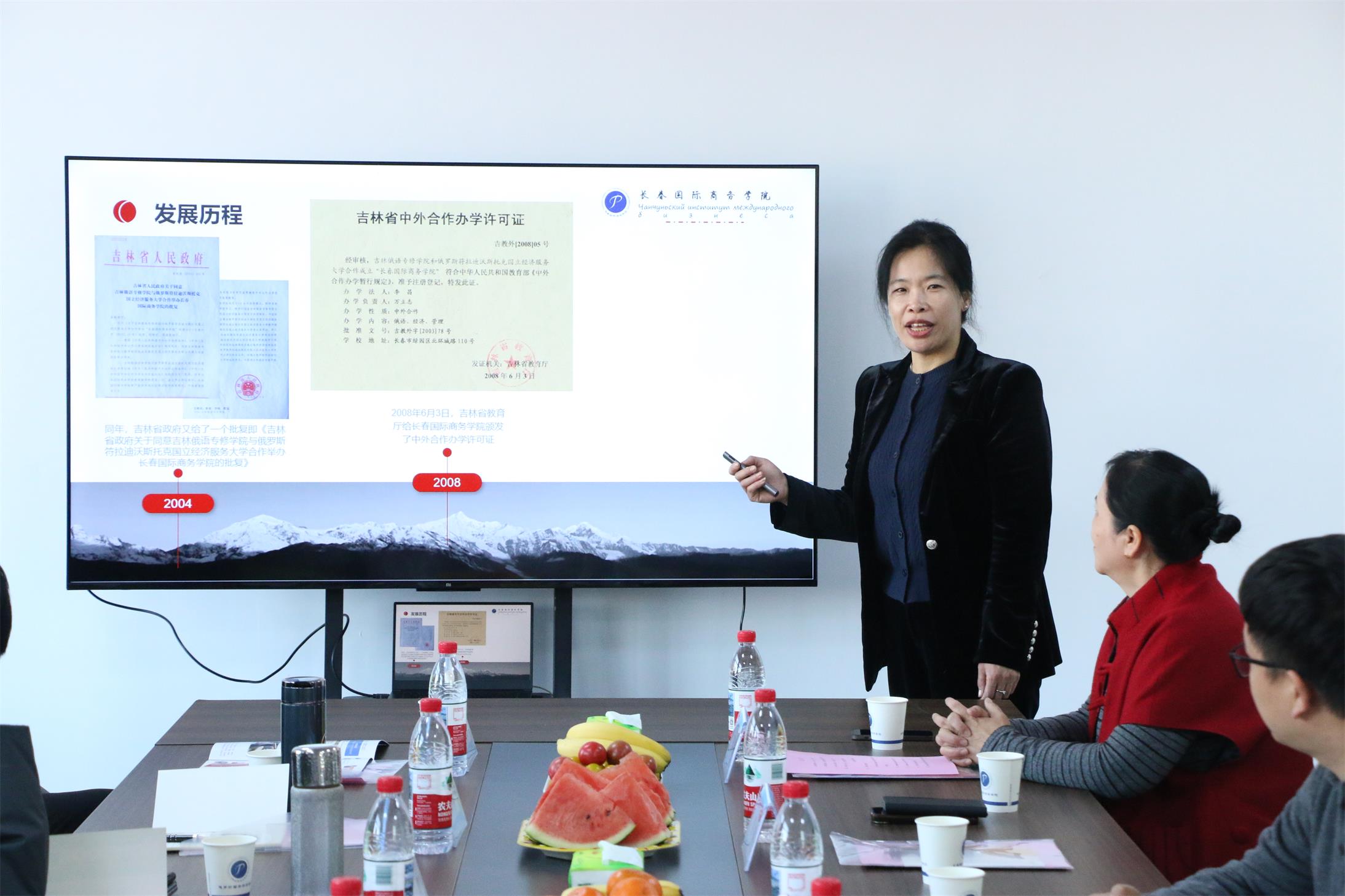 考察活动在友好而热烈的氛围中拉开帷幕。会上,长春国际商务学院张院长首先代表学院对河北代表团领导的到来表示诚挚欢迎,并就学院的基本概况、发展历程、办学理念及国际化特色进行了简要介绍。随后,杨副院长为代表团详细讲解了我院与俄罗斯、白俄罗斯知名高校合作开展的本硕连读项目,重点介绍了项目的培养模式、课程体系、国际交流平台及学位授予情况,充分展示了我院在国际教育合作方面的丰硕成果与独特优势。