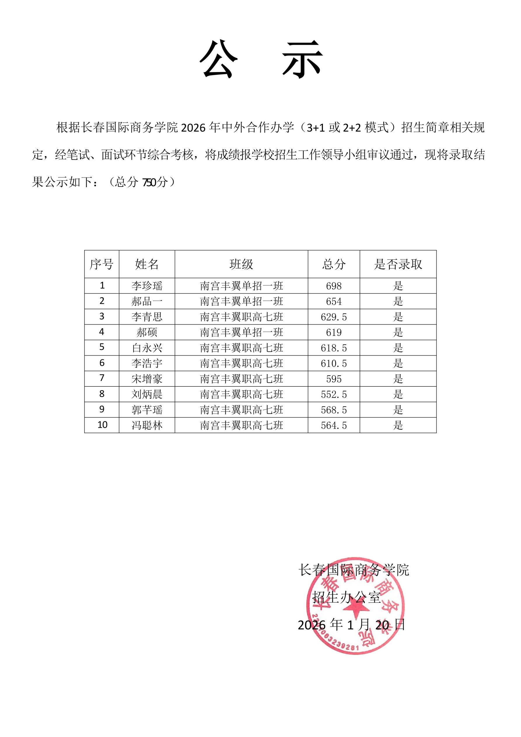 长春国际商务学院2026年年初【部分】录取公示
