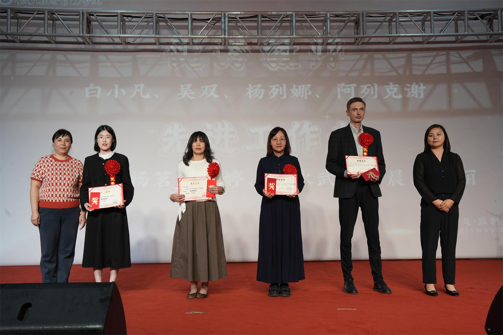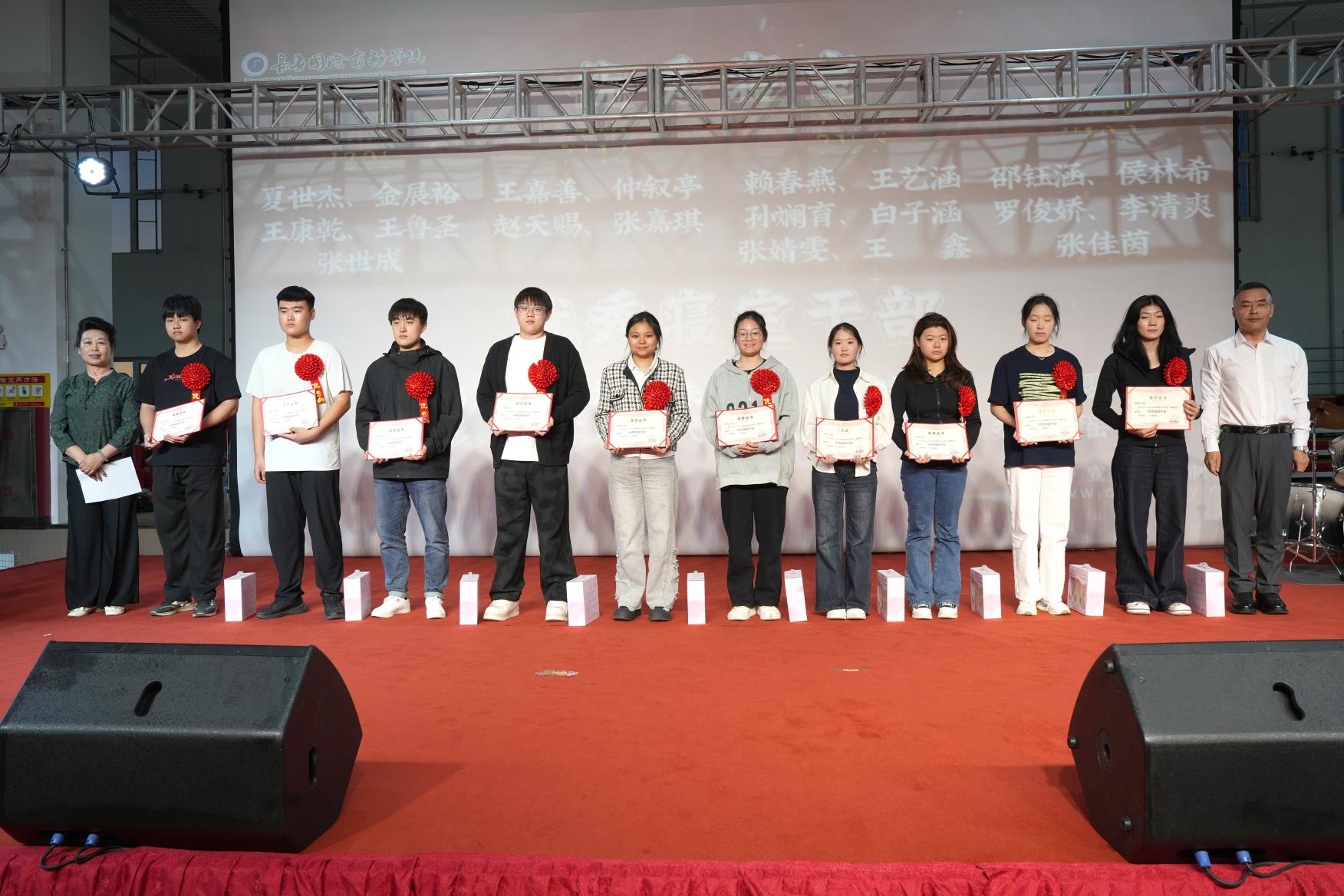 教师代表吴双老师(俄语翻译:张琪同学)、老生代表张敬博、新生代表马晶晶分别上台发言。