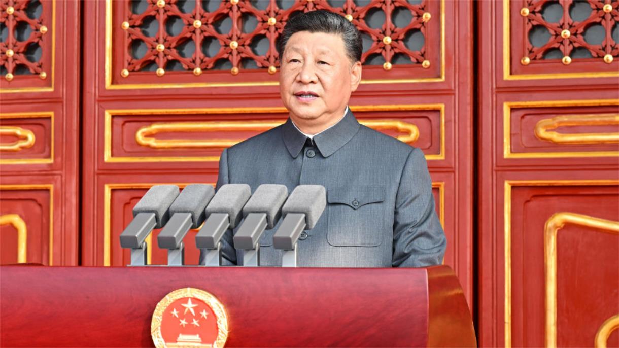 Китайская нация — великая нация, которая самостоятельно стремится вперёд, не боясь тиранов. В своё время перед титанической схваткой между добром и злом, светом и тьмой, прогрессом и мракобесием, наш народ, сплочённый в борьбе против врага, начал битву за выживание страны, возрождение нации и торжество справедливости для всего человечества. Сегодня всему миру предстоит сделать выбор перед такими противоречиями, как мир и война, диалог или конфронтация, обоюдный выигрыш и игра с нулевой суммой. Китайский народ твёрдо стоит на правильной стороне истории и прогресса человеческой цивилизации, неуклонно идёт по пути мирного развития и прилагает совместные с народами всего мира усилия для построения сообщества единой судьбы человечества.