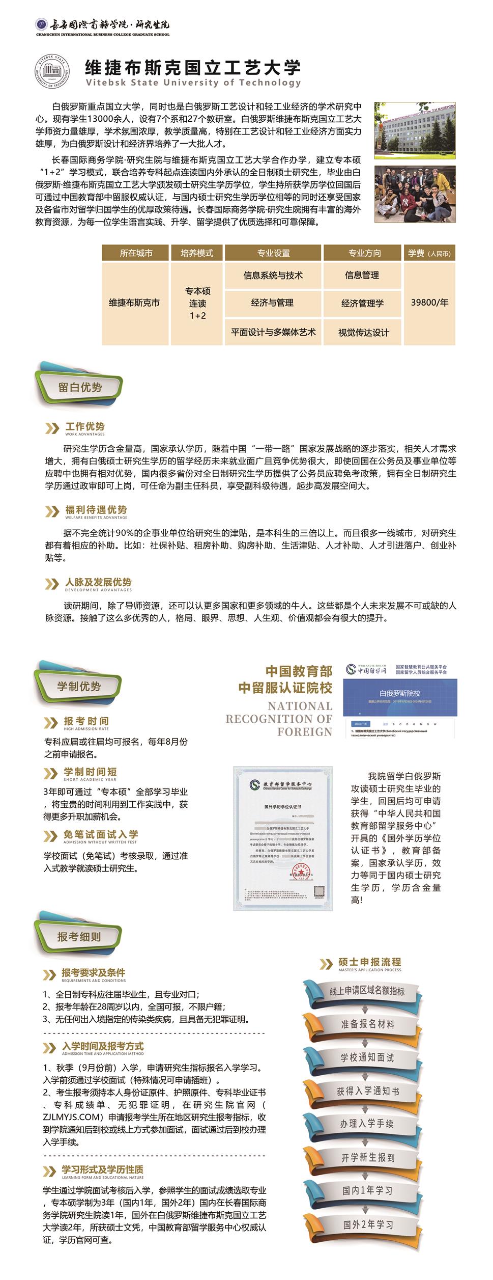 我院与白俄罗斯维捷布斯克国立工艺大学联合办学培养“1+2”专本硕项目,大学专科毕业学生可以通过该项目直接实现获得硕士研究生学历学位的梦想。