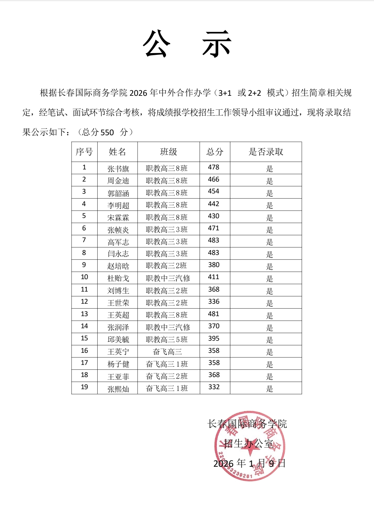 长春国际商务学院2026年年初【部分】录取公示