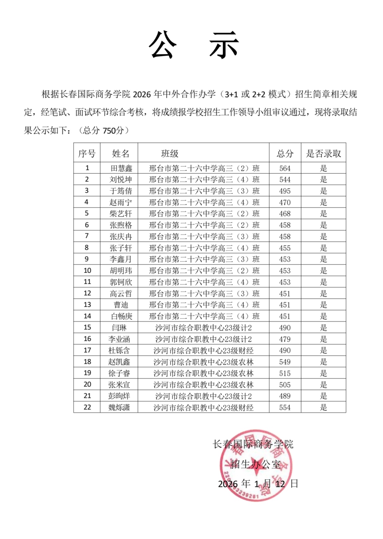 长春国际商务学院2026年年初【部分】录取公示