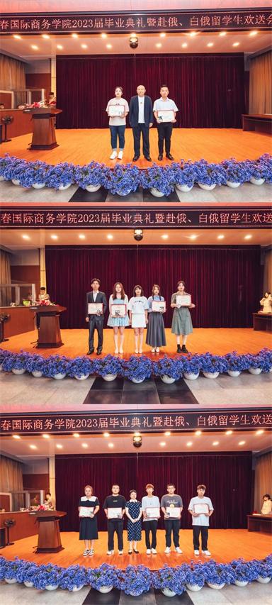毕业典礼上为荣获2023届的******毕业生、******学生干部和“勤学奖”的同学们颁奖。董静老师代表全体教师发言,鼓励同学们把俄语专业知识灵活运用到工作实际中去,学以致用,为把自己打造成一个终生学习型的人才而努力。赴俄留学学生孙敏然、冯昊鹏代表全体毕业******言,他们表达了对老师的感激之情,对母校的深情和留恋。他们表示:难忘大学生活,铭记领导老师的嘱托,求实创新,踔厉前行,一定会以优异的学业成绩向母校和老师汇报。