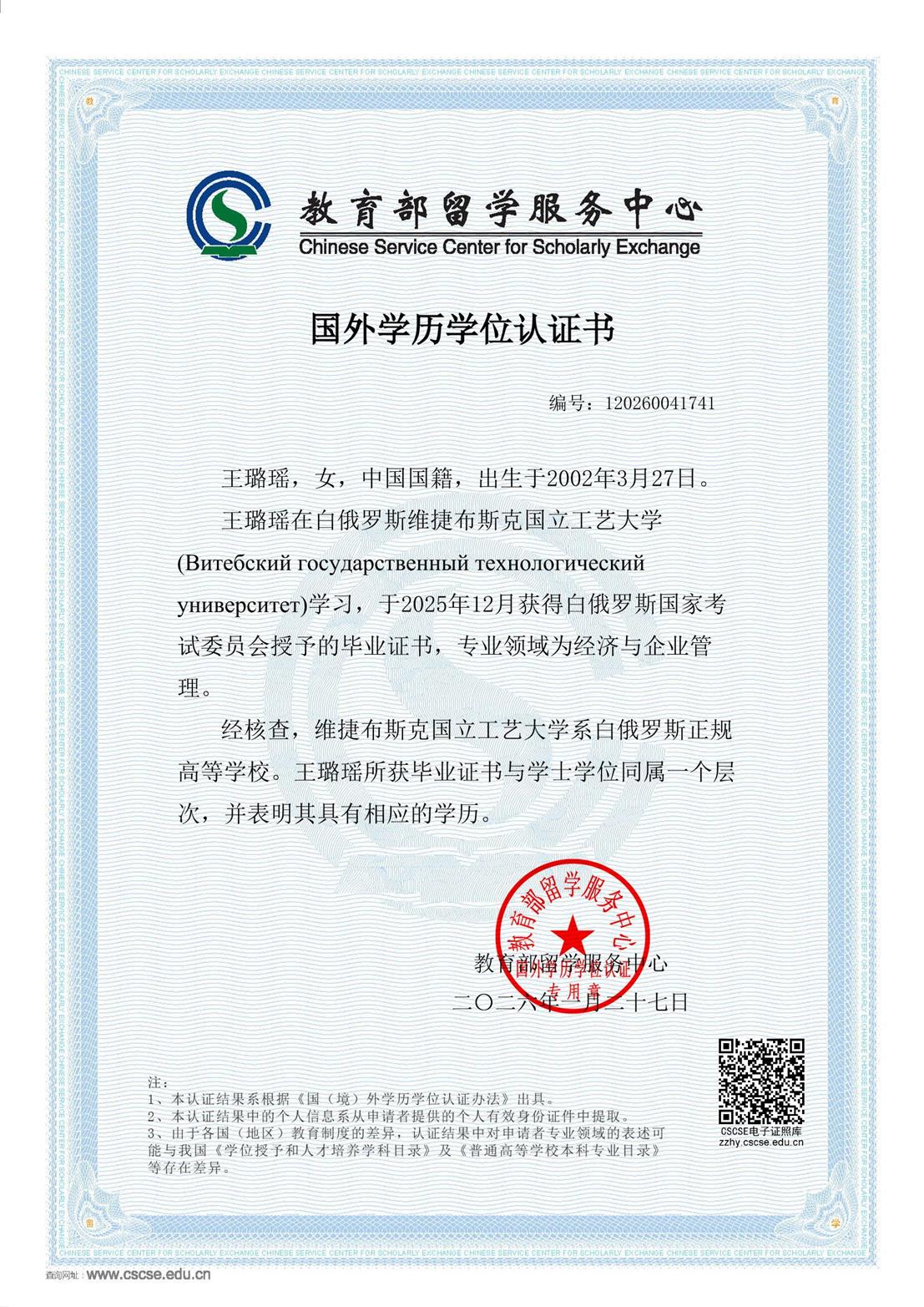 尤为重要的是,王璐瑶同学所获得的学位证书,已顺利通过中国(教育部)留学服务中心的权威认证。该认证是国家对留学人员境外学历学位进行核实与确认的官方渠道,认证成功,意味着其所获学历学位得到中国政府的正式承认,具备与国内相应学历学位同等的法律效力与认可度,为其未来在国内深造、就业、参加各类资格考试及职业发展奠定了坚实的基础。